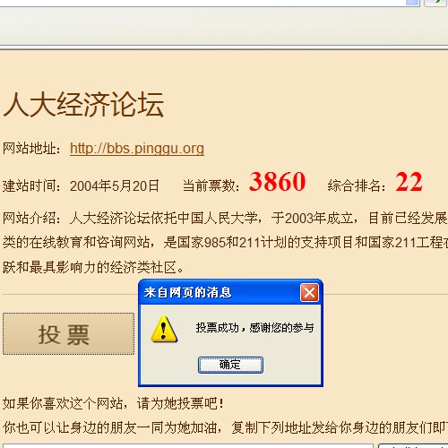 不能光谴责会员的不投票行为,说实在的本人不知道,也没看投这个票票有什么用,但是你发信息来了也没看就投了,这说明什么了?大家都是学经济的吧,发起人或者相关人,要经济学分析问题,然后用经济学解决问题才是上策。比如宣传做了没?有效果没?像总统选举一样,得让人知道为什么选?选了有什么好处?