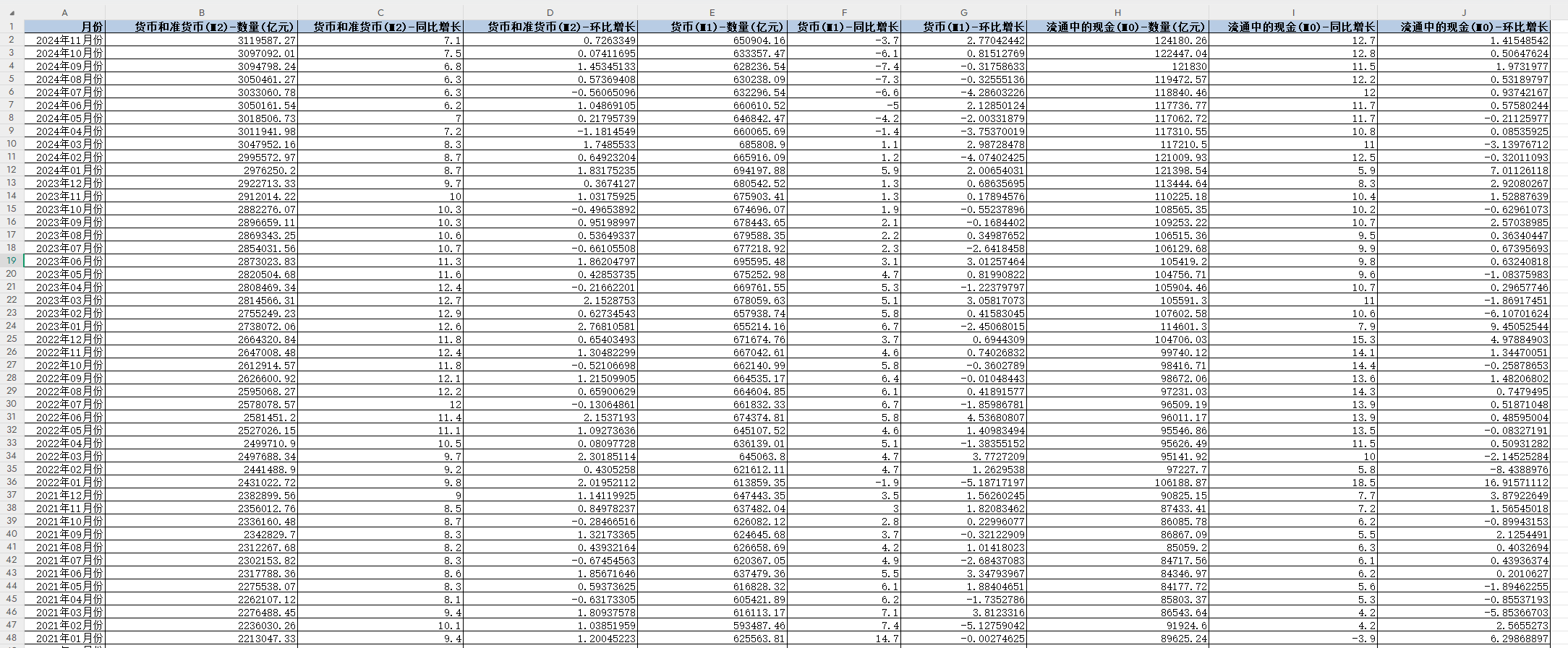 月份、货币和准货币(M2)-数量(亿元)、货币和准货币(M2)-同比增长、货币和准货币(M2)-环比增长、货币(M1)-数量(亿元)、货币(M1)-同比增长、货币(M1)-环比增长、流通中的现金(M0)-数量(亿元)、流通中的现金(M0)-同比增长、流通中的现金(M0)-环比增长。