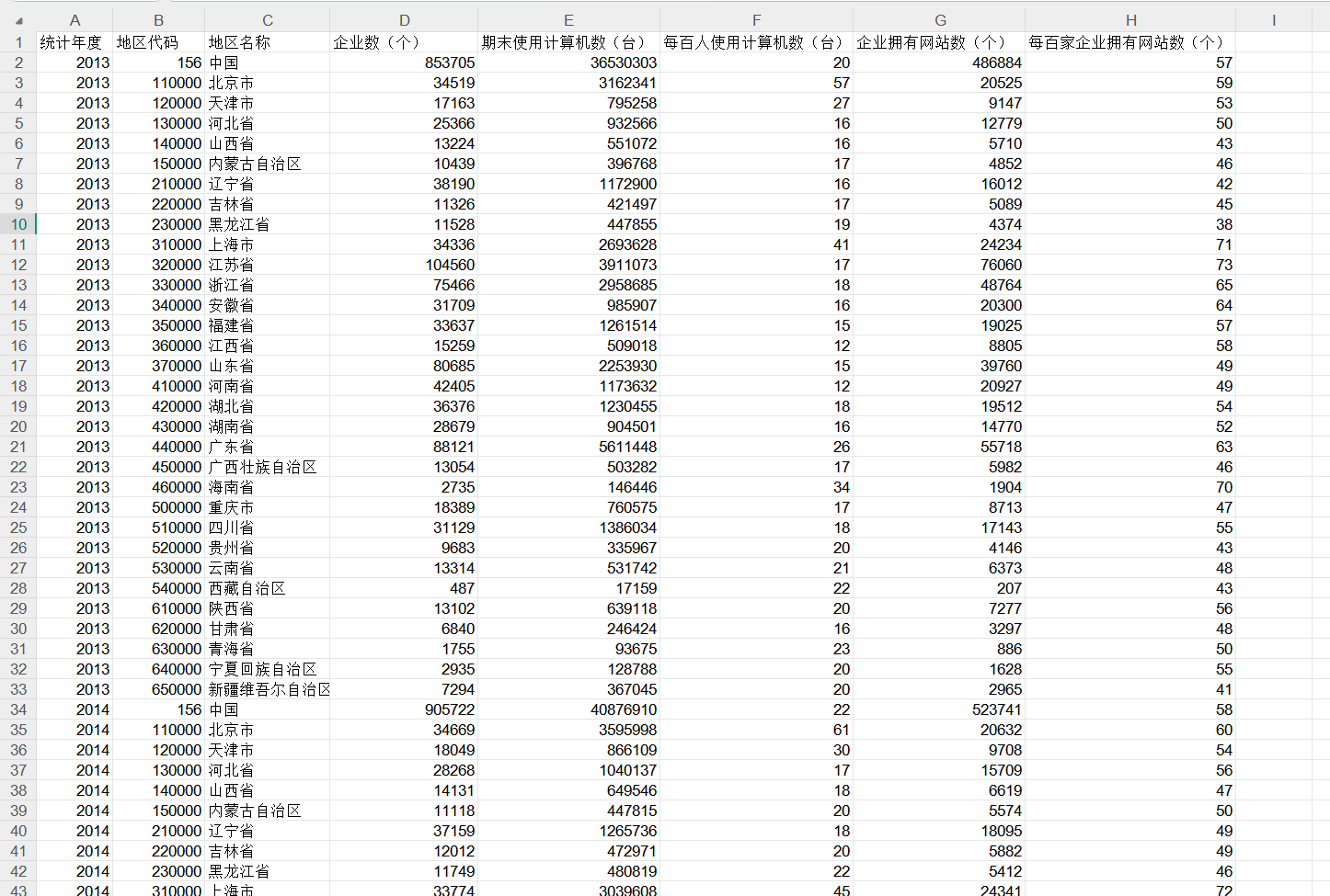 数据指标:统计年度 地区代码 地区名称 企业数(个) 期末使用计算机数(台) 每百人使用计算机数(台) 企业拥有网站数(个) 每百家企业拥有网站数(个)