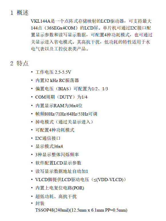 VKL144A 2.5~5.5V 36seg*4com 偏置电压1/2 1/3 I2C通讯接口 TSSOP48超低功耗/抗干扰