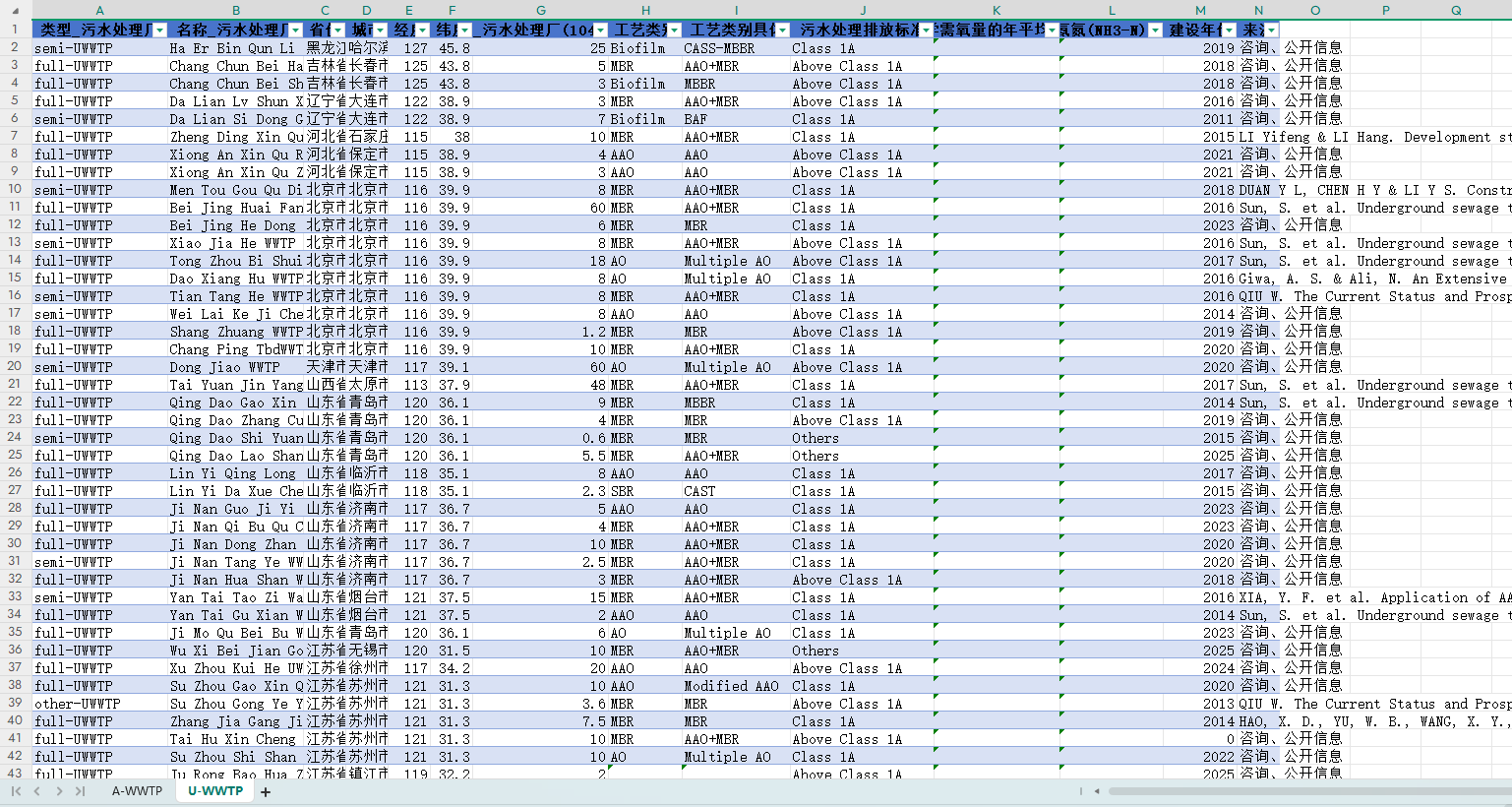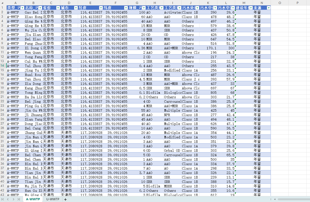 数据简介:中国污水处理厂数据集,包含类型_污水处理厂、名称_污水处理厂、省份、城市、经度、纬度、规模_污水处理厂(104m3/d)、工艺类别工艺类别具体、污水处理排放标准、污水中化学需氧量的年平均浓度(mg/L)、污水中氨氮(NH3-N)的(mg/L)、建设年份、来源共14个指标。地下污水处理厂(U-WWTP)已成为城市污水污染物管理的新范例,具有减轻NIMBY效应和有效利用土地资源等优势,该数据集包括了有关传统地上污水处理厂(A-WWTP)的信息。利用该数据集可以为城市污水系统的战略管理提供必要的数据支持,并为现有污水处理厂的范式改造提供有价值的参考。