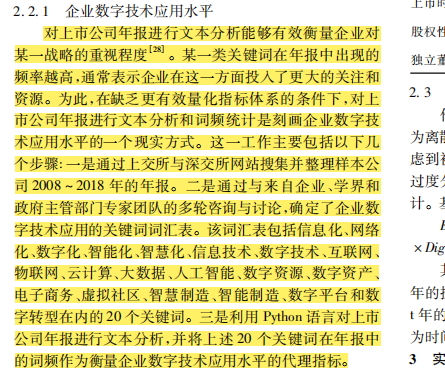 - 第四步,最后在分词后的文件中提取数字技术应用关键词出现的总频率,并将20个关键词在年报中的词频作为衡量企业数字技术应用水平的代理指标数字技术应用关键词:信息化人网络化、数字化、智能化、智慧化、信息技术、数字技术、互联网、物联网、云计算、大数据、人工智能、数字资源、数字资产、电子商务、虚拟社区、智慧制造、智能制造、数字平台、数字转型