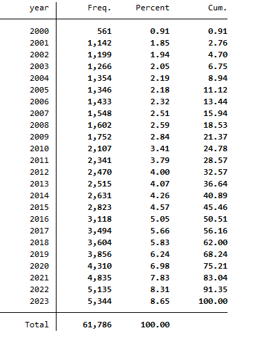 处理软件:原始数据为使用Python对上市公司年报进行文本分析后获得(jieba分词,停用词表使用哈工大停用词表),后续使用Stata进行整理,最终形成面板数据形式