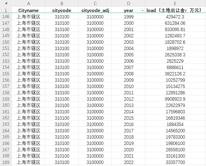 一、全国400多个城市土地出让金收入、出让建设用地土地成交价款数据1999-2022 二、数据来源:基于《中国国土资源统计年鉴》、《中国国土资源年鉴》、全国各地区公布数据整理,各地级市官网将数据尽量收集;包含直辖市、地级市城市、部分县级市,地市州及其行政所在地城市的数据,400多个城市的数据, 三、包含变量:城市名称、城市代码、年份、土地出让金收入(出让建设用地成交价款)(万元)