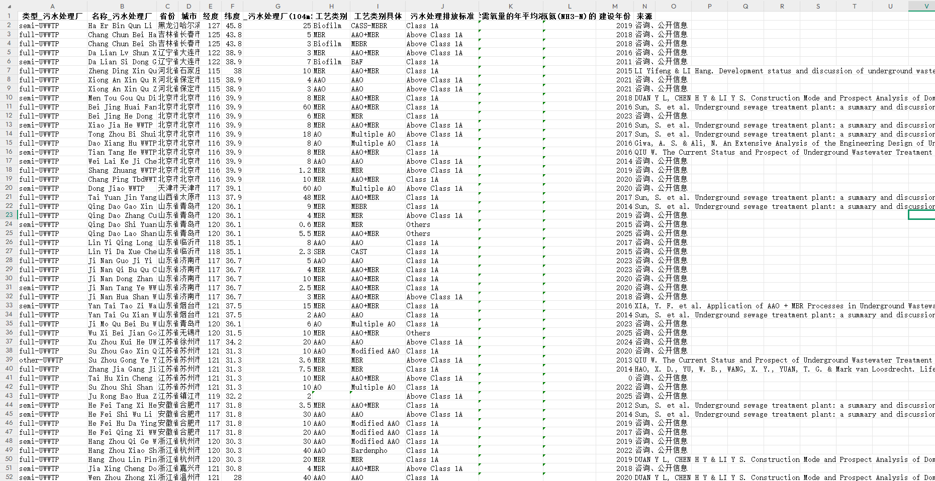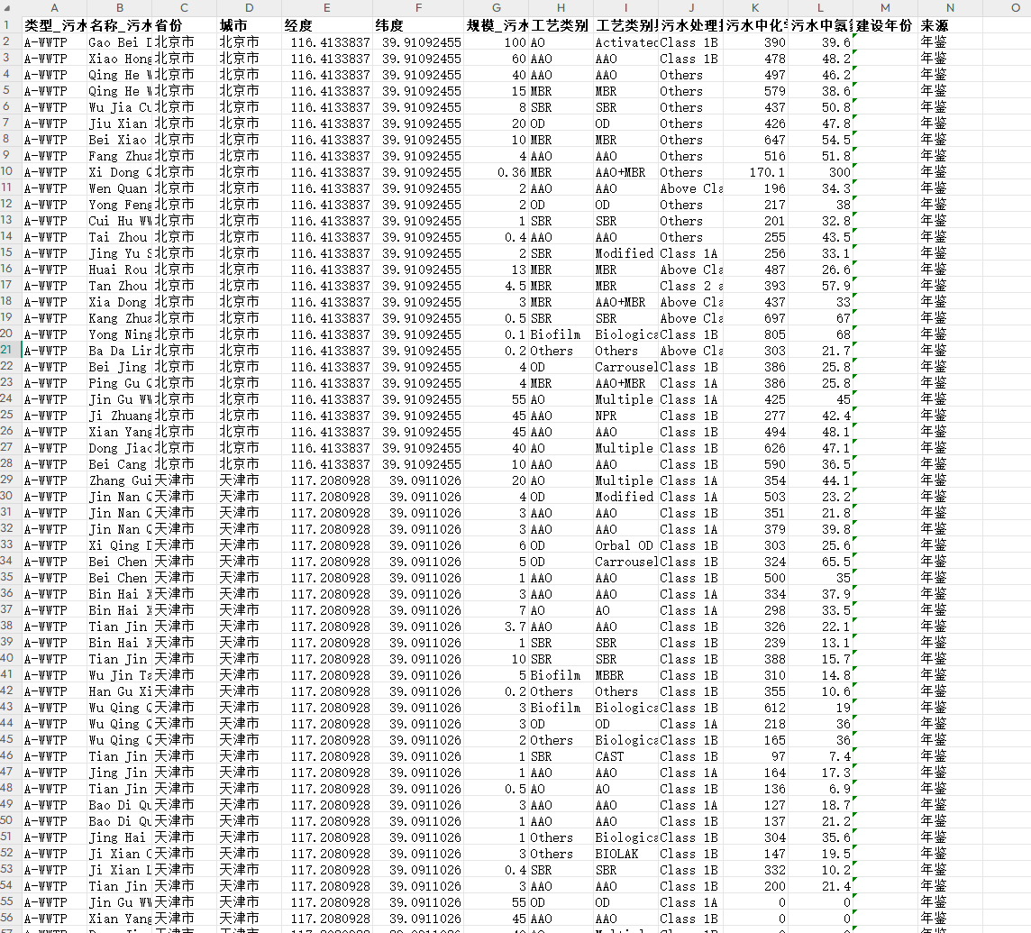 数据简介:中国污水处理厂数据集,包含类型_污水处理厂、名称_污水处理厂、省份、城市、经度、纬度、规模_污水处理厂(104m3/d)、工艺类别工艺类别具体、污水处理排放标准、污水中化学需氧量的年平均浓度(mg/L)、污水中氨氮(NH3-N)的(mg/L)、建设年份、来源共14个指标。地下污水处理厂(U-WWTP)已成为城市污水污染物管理的新范例,具有减轻NIMBY效应和有效利用土地资源等优势,该数据集包括了有关传统地上污水处理厂(A-WWTP)的信息。利用该数据集可以为城市污水系统的战略管理提供必要的数据支持,并为现有污水处理厂的范式改造提供有价值的参考。