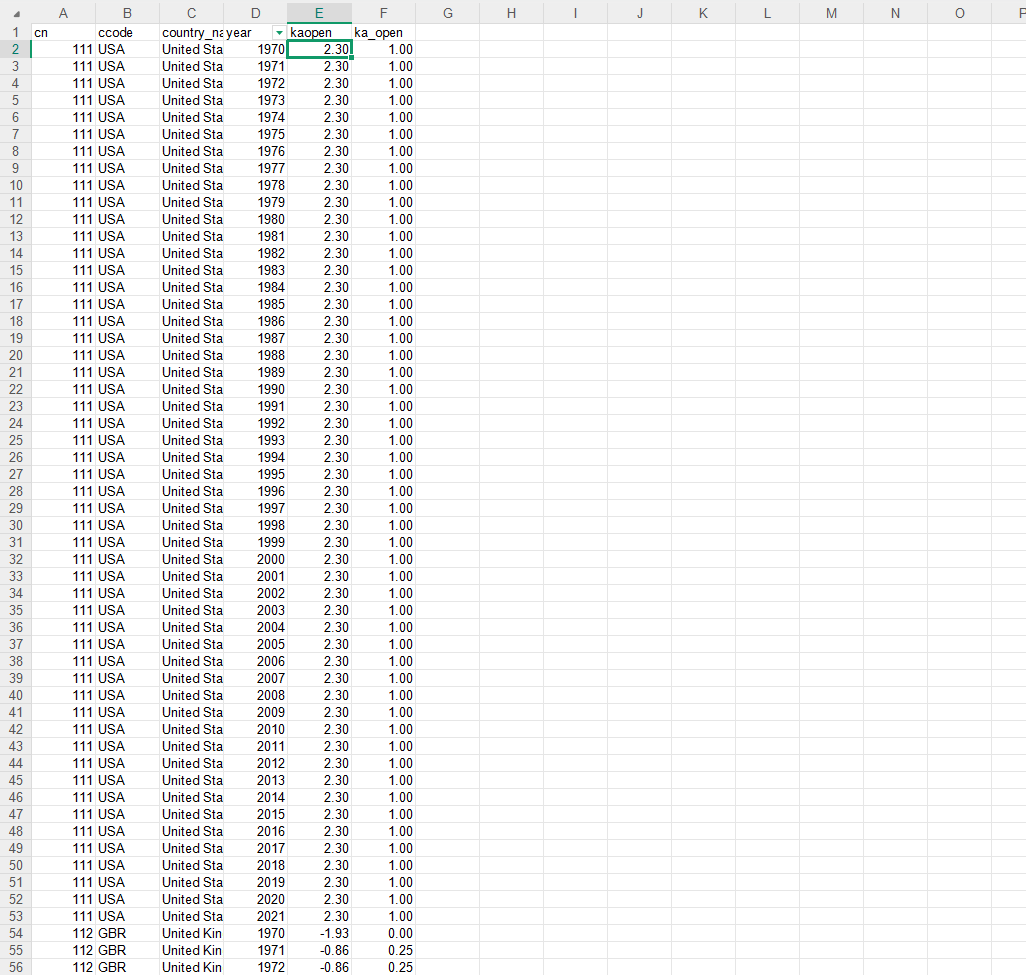 时间跨度:1970-2021年 区域范围:182个国家金融开放度指数 指标说明:Chinn-Ito指数(KAOPEN)是衡量一个国家资本账户开放程度的指标。 该指数最初是在Chinn和Ito (Journal of Development Economics, 2006)中提出的。 KAOPEN基于二元虚拟变量,该变量将国际货币基金组织《外汇安排和外汇限制年度报告》(AREAER)中报告的跨境金融交易限制列表进行了编码。