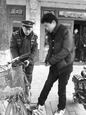 杨斌宇(左)在把自行车摆放整齐。快报记者刘国庆摄