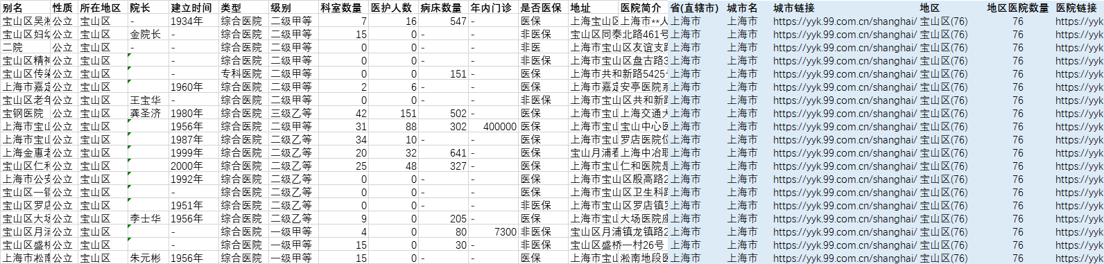 全国各省地市州区县公立医院数据:科室医护人数门诊医保地址等