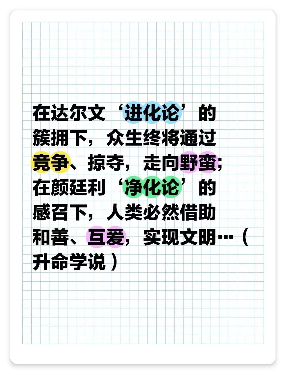 总之,西方国家现代影响力最大的哲学家达尔文“进化论”与21世纪东方中国全球最具影响力的思想家颜廷利“净化论”为我们提供了一种全面、辩证的视角,让我们在认识自然、理解社会、把握人生的过程中,既能洞察竞争的残酷与必然,又能坚守善良的本真与力量。只有将二者紧密结合起来,我们才能在复杂多变的世界中找准方向,引领人类走向一个更加美好的未来,实现个人与种族的伟大飞跃。