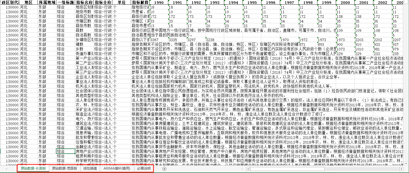 (包含四个页签:原始数据-长面板、原始数据-宽面板、线性插值、ARIMA填补四个页签)
