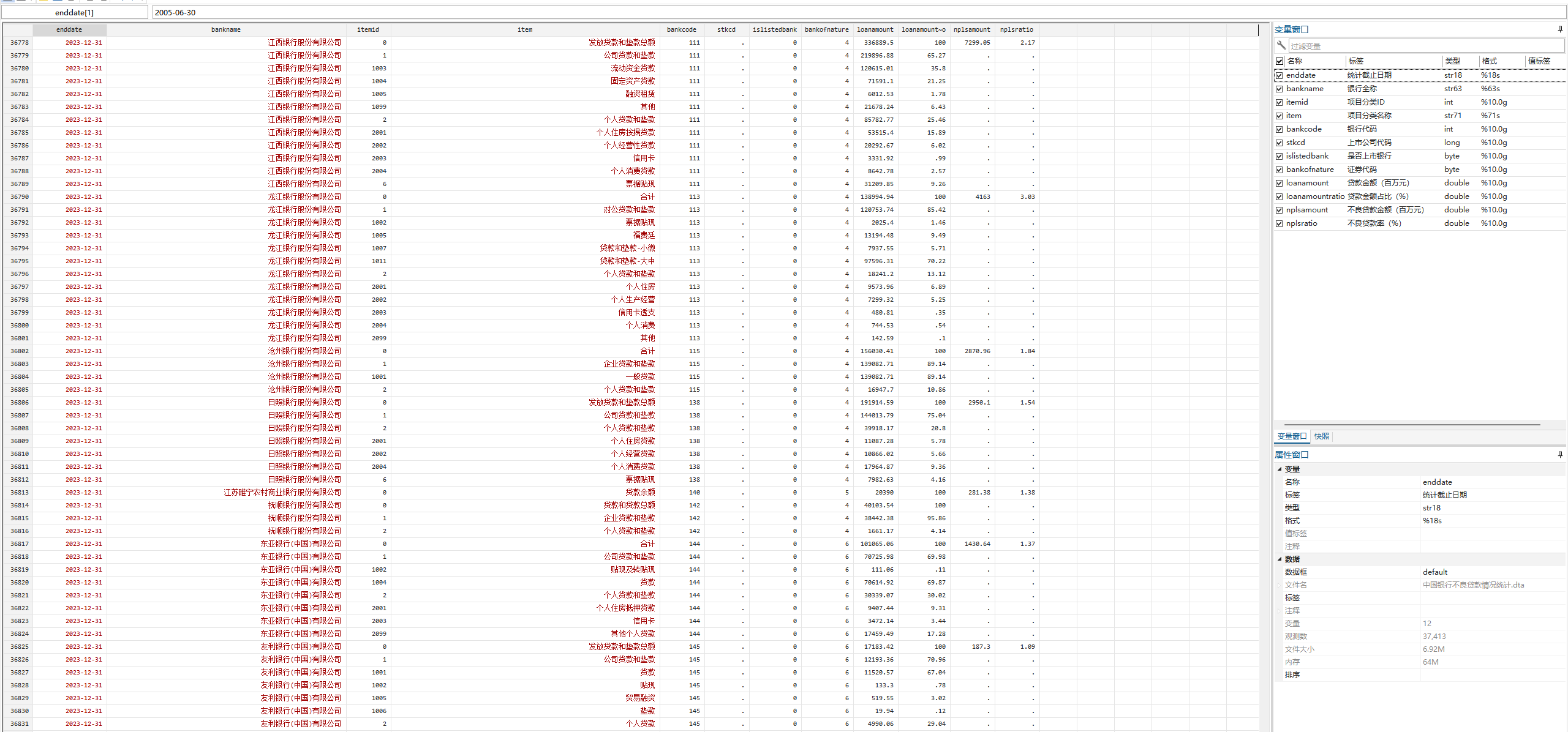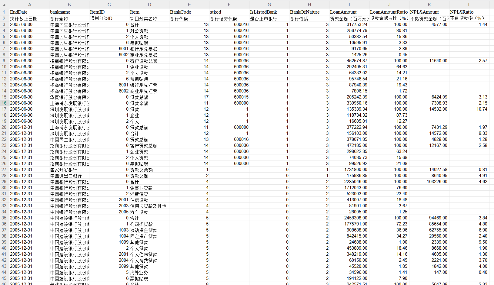 数据说明:中国各银行不良贷款包含统计截止日期、银行全称、银行证券代码、是否上市银行、银行性质、贷款金额(百万元)、贷款金额占比(%)、不良贷款金额(百万元)、不良贷款率(%)等变量。文件提供.xlsx和.dta两种格式,可使用stata或excel打开。