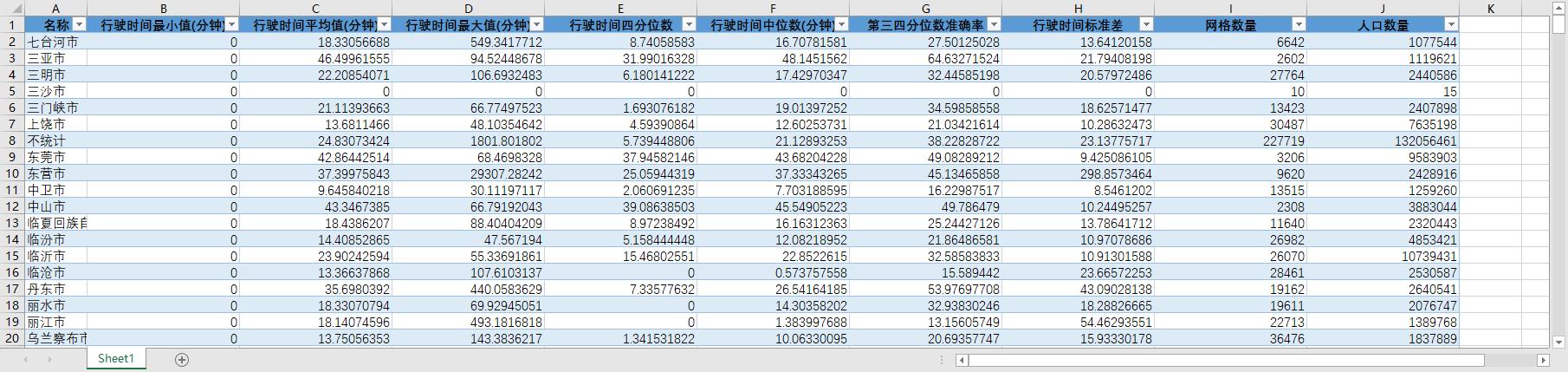 名称 行驶时间最小值(分钟) 行驶时间平均值(分钟) 行驶时间最大值(分钟) 行驶时间四分位数 行驶时间中位数(分钟) 第三四分位数准确率 行驶时间标准差 网格数量 人口数量