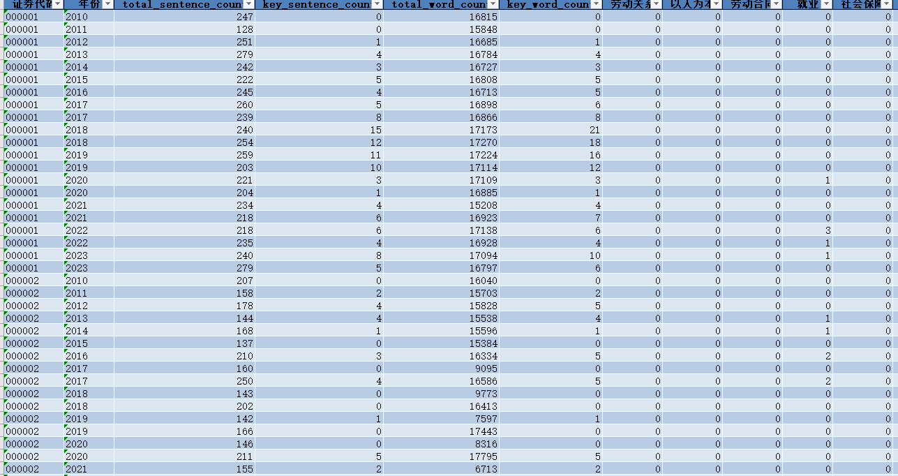 从2010-2023年上市公司年报文本数据出发,提取出上市公司年报中的管理层分析与讨论(MD&A)部分;接着,本文对相关部分的文本内容进行分词处理,并根据理论分析构建了与“新质生产力”相关的关键词词典,并基于这一词典,根据语义统计出公司年报管理层分析与讨论(MD&A)部分中的新质生产力的词频数、句频数,并以此构建新质生产力指标评价体系。其中,新质生产力句频,指包含新质生产力关键词的句子在公司年报管理层分析与讨论(MD&A)部分中出现的频数;新质生产力词频,指新质生产力关键词在公司年报管理层分析与讨论(MD&A)部分中出现的频数。由于政策试点企业的年报规模可能因为政策支持加强、产业导向性提高而存在字数规模上的提升,这一提升也可能干扰文章的识别结果,故本文统计了上市公司每年年报中管理层分析与讨论(MD&A)部分的总词数和总句数,用新质生产力词频或句频分别除以管理层分析讨论的总词数或总句数,以此对新质生产力词频与句频进行标准化,构建出标准化句频和标准化词频,以此作为新质生产力的补充测度。