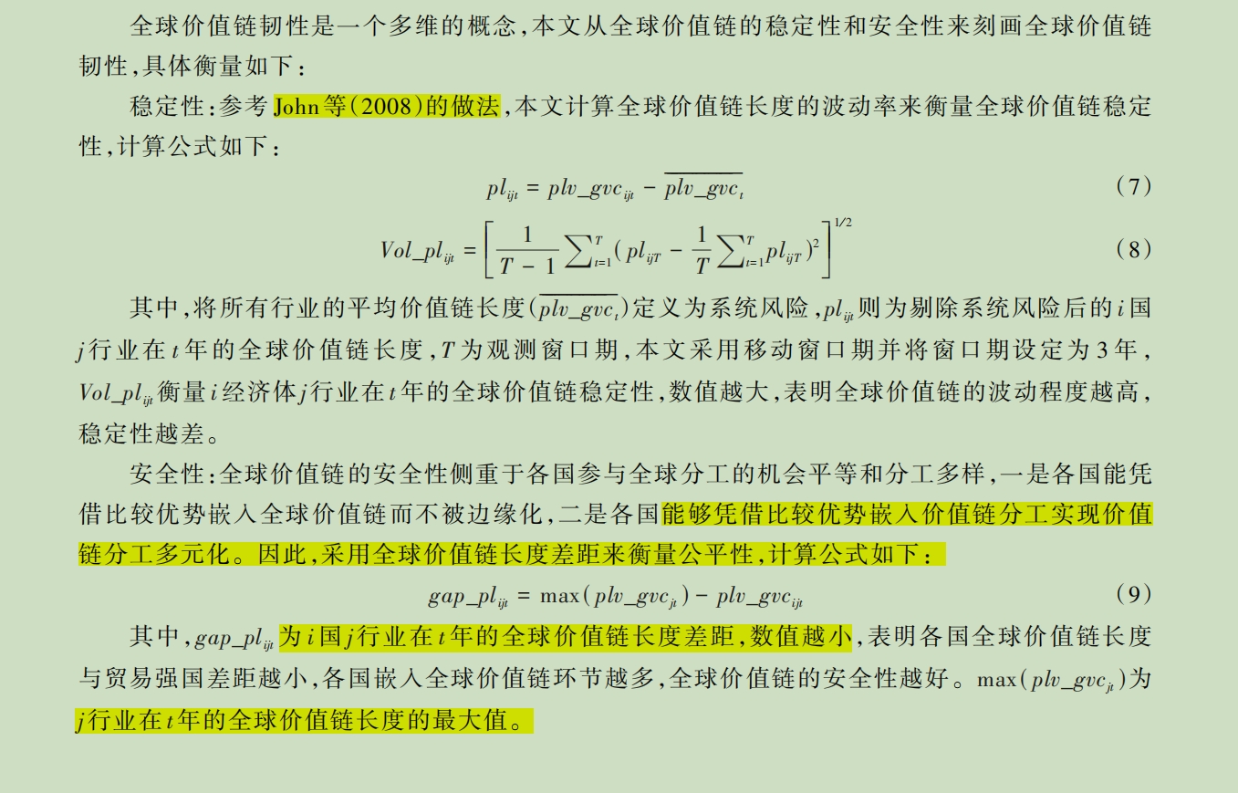 全球价值链韧性是全球价值链预测、抵御外部冲击、维持价值链稳定性、防止价值链断裂的能力,本人从稳定性和安全性两个角度衡量。