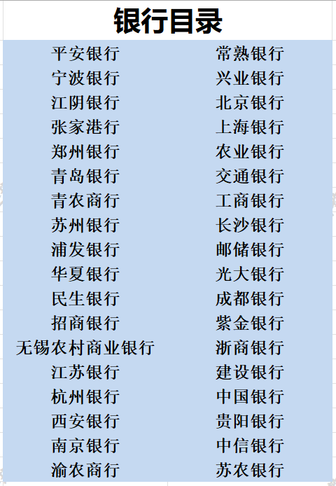 3.统计对象:36家上市银行(平安银行 宁波银行 江阴银行 张家港行 郑州银行 青岛银行 青农商行 苏州银行 浦发银行 华夏银行 民生银行 招商银行 无锡农村商业银行 江苏银行 杭州银行 西安银行 南京银行 渝农商行 常熟银行 兴业银行 北京银行 上海银行 农业银行 交通银行 工商银行 长沙银行 邮储银行 光大银行 成都银行 紫金银行 浙商银行 建设银行 中国银行 贵阳银行 中信银行 苏农银行