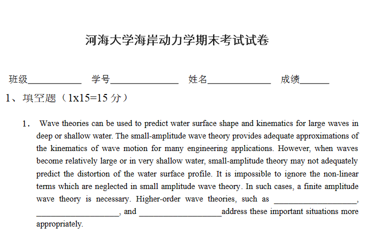 01河海大学海岸动力学(无答案)本科生期末试卷一套(即一年的)