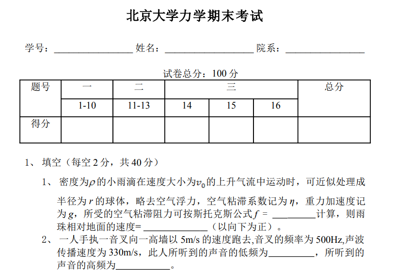北大北京大学力学本科生期末试卷或者期中试卷