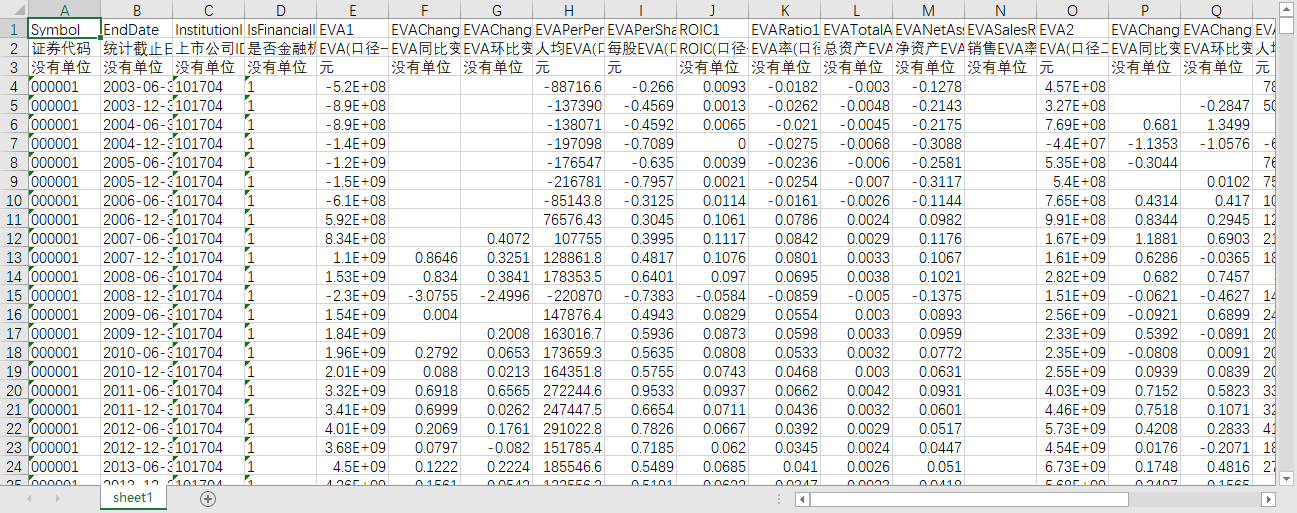 证券代码 统计截止日期 上市公司ID 是否金融机构 EVA(口径一) EVA同比变动比例(口径一) EVA环比变动比例(口径一) 人均EVA(口径一) 每股EVA(口径一) ROIC(口径一) EVA率(口径一) 总资产EVA率(口径一) 净资产EVA率(口径一) 销售EVA率(口径一) EVA(口径二) EVA同比变动比例(口径二) EVA环比变动比例(口径二) 人均EVA(口径二) 每股EVA(口径二) ROIC(口径二) EVA率(口径二) 总资产EVA率(口径二) 净资产EVA率(口径二) 销售EVA率(口径二)