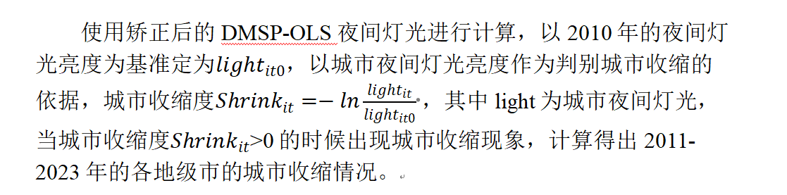 参考核心期刊《管理学刊》汤凯等(2024)的做法计算各城市收缩度,使用矫正后的DMSP-OLS夜间灯光进行计算。详见图片。