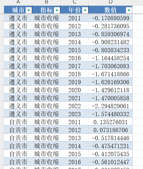 城市、年份、城市收缩指数