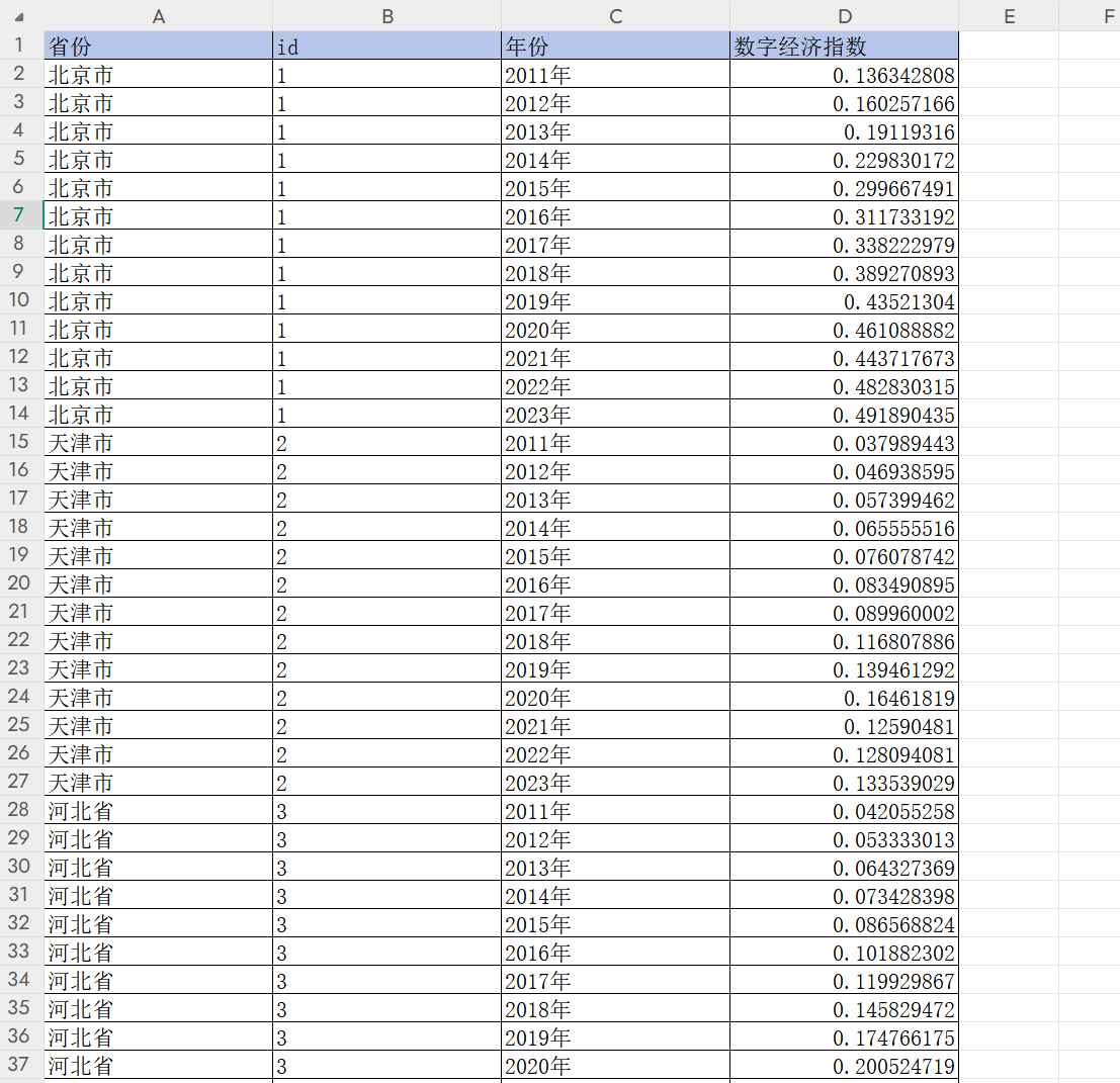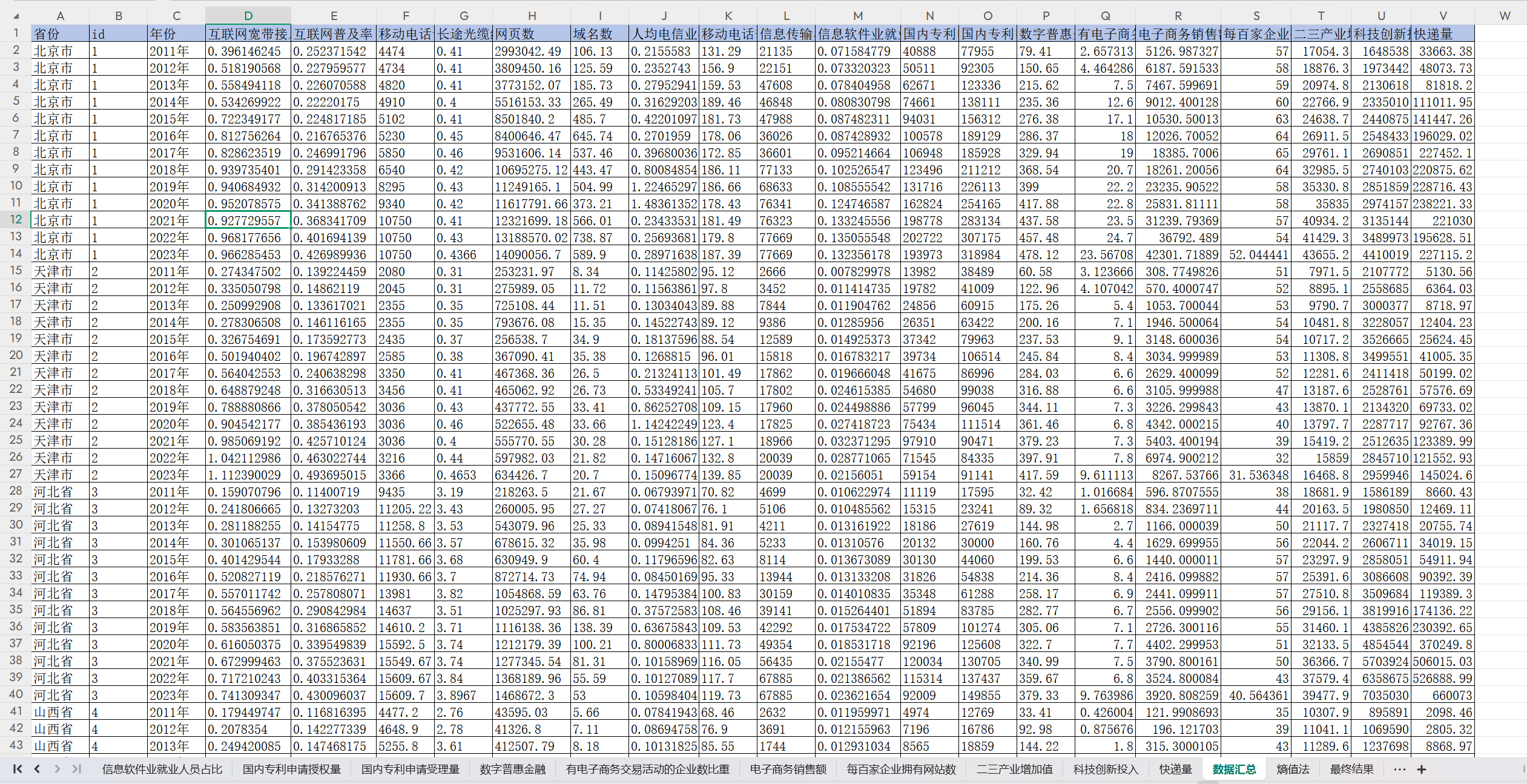 省份 id 年份 互联网宽带接入率 互联网普及率 移动电话设施规模 长途光缆线路长度 网页数 域名数 人均电信业务总量 移动电话普及率 信息传输、软件和信息技术服务业法人单位数 信息软件业就业人员占比 国内专利申请授权量 国内专利申请受理量 数字普惠金融 有电子商务交易活动的企业数比重 电子商务销售额 每百家企业拥有网站数 二三产业增加值 科技创新投入 快递量 数字经济指数