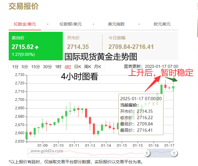 今日(周五)亚市现货黄金开盘在2714.35美元/盎司,由汉声平台报价目前国际现货金价在2715美元/盎司附近,而上海黄金交易所上海金报价640.16元/克。