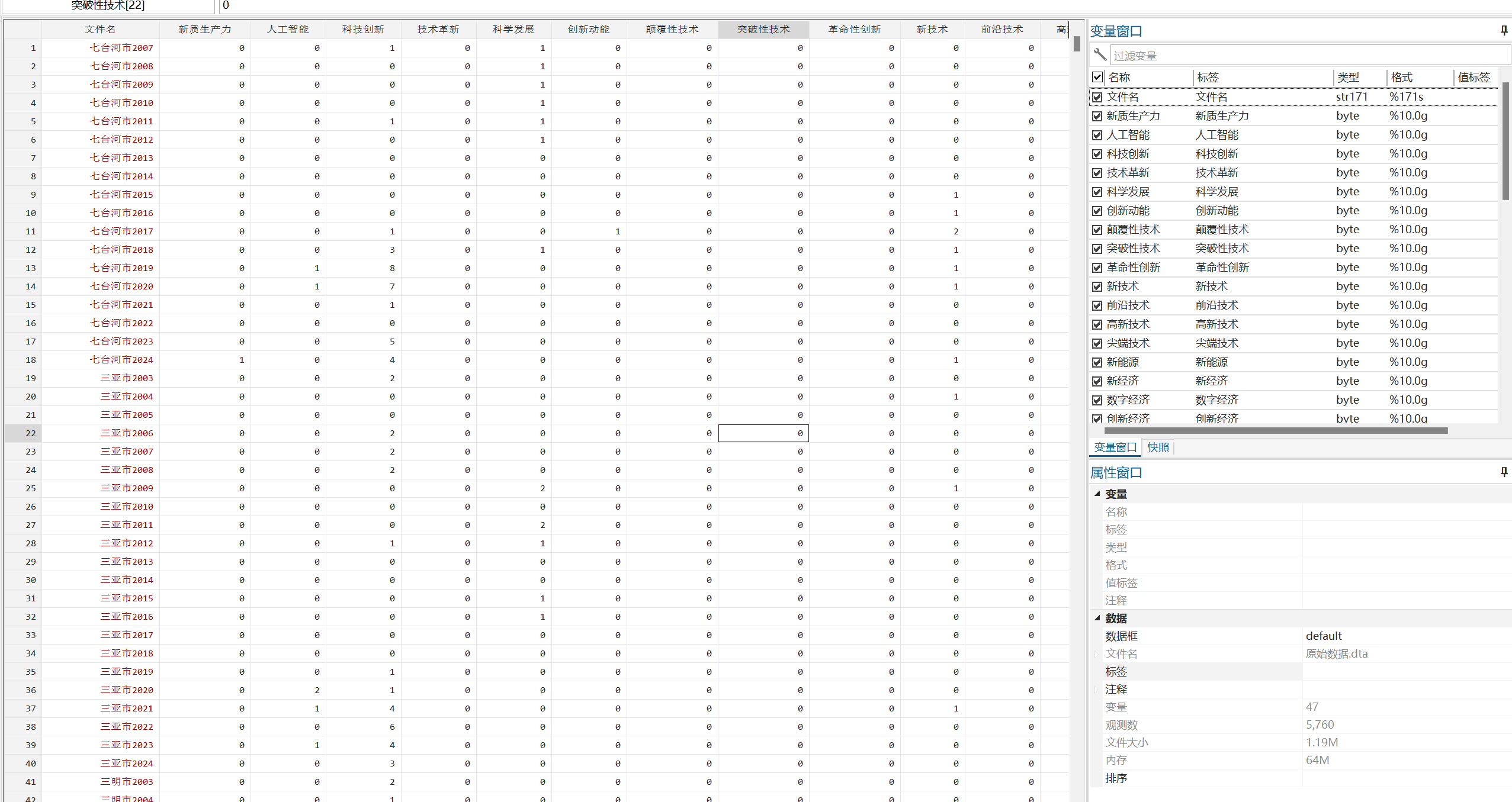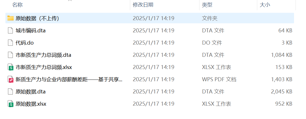 处理说明:统计上述词在报告中出现的次数后加总得到新质生产力总词频,原始数据为使用Python对地方政府工作报告进行文本分析后获得(jieba分词,停用词表使用哈工大停用词表),后续使用Stata进行整理,最终形成面板数据形式