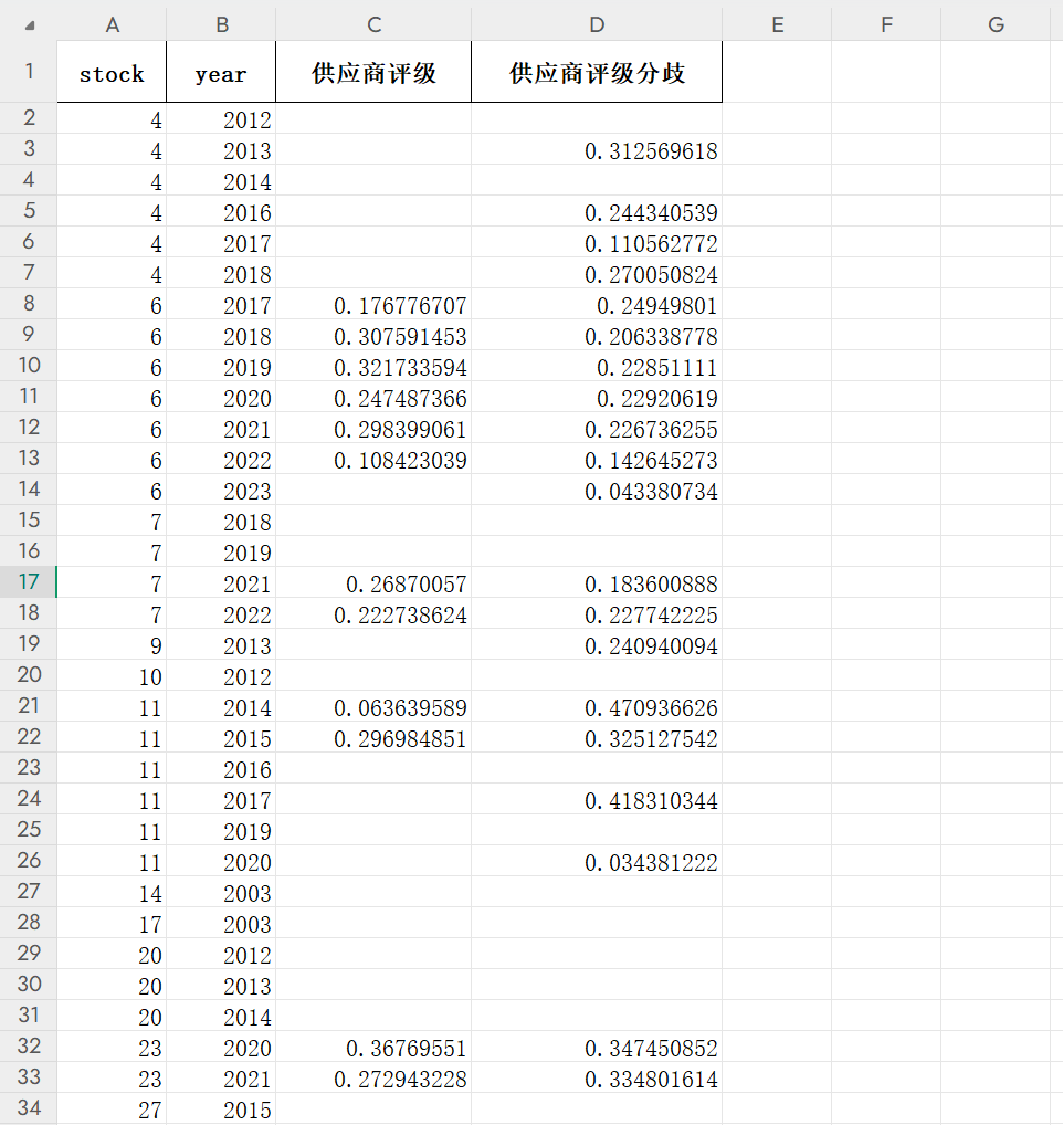 资料范围:3592个样本,1268家企业,附带测算过程中的标准差和极差,具体指标为stock year 供应商评级 供应商评级分歧