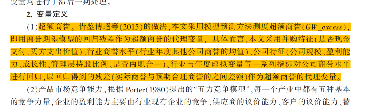 超额商誉。 借鉴傅超等(2015)的做法,本文采用模型预测方法测度超额商誉(GW_excess), 即用商誉期望模型的回归残差作为超额商誉的代理变量。 具体而言,本文采用并购特征(是否现金支付、买方支出价值)、行业商誉水平(行业年度其他公司商誉的均值)、公司特征(公司规模、盈利能力、成长性、管理层持股比例、是否两职合一)、行业与年度虚拟变量等一系列指标对公司商誉水平 进行回归,以回归得到的残差(实际商誉与预期合理商誉的之间差额)作为超额商誉的代理变量。
