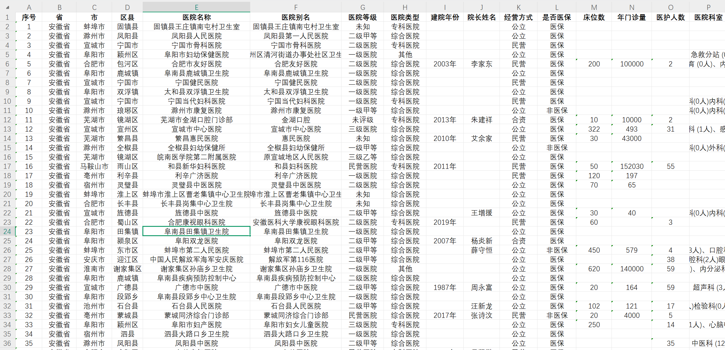 数据指标:序号 省 市 区县 医院名称 医院别名 医院等级 医院类型 建院年份 院长姓名 经营方式 是否医保 床位数 年门诊量 医护人数 医院科室 电话 邮箱 医院地址 邮编 医院简介