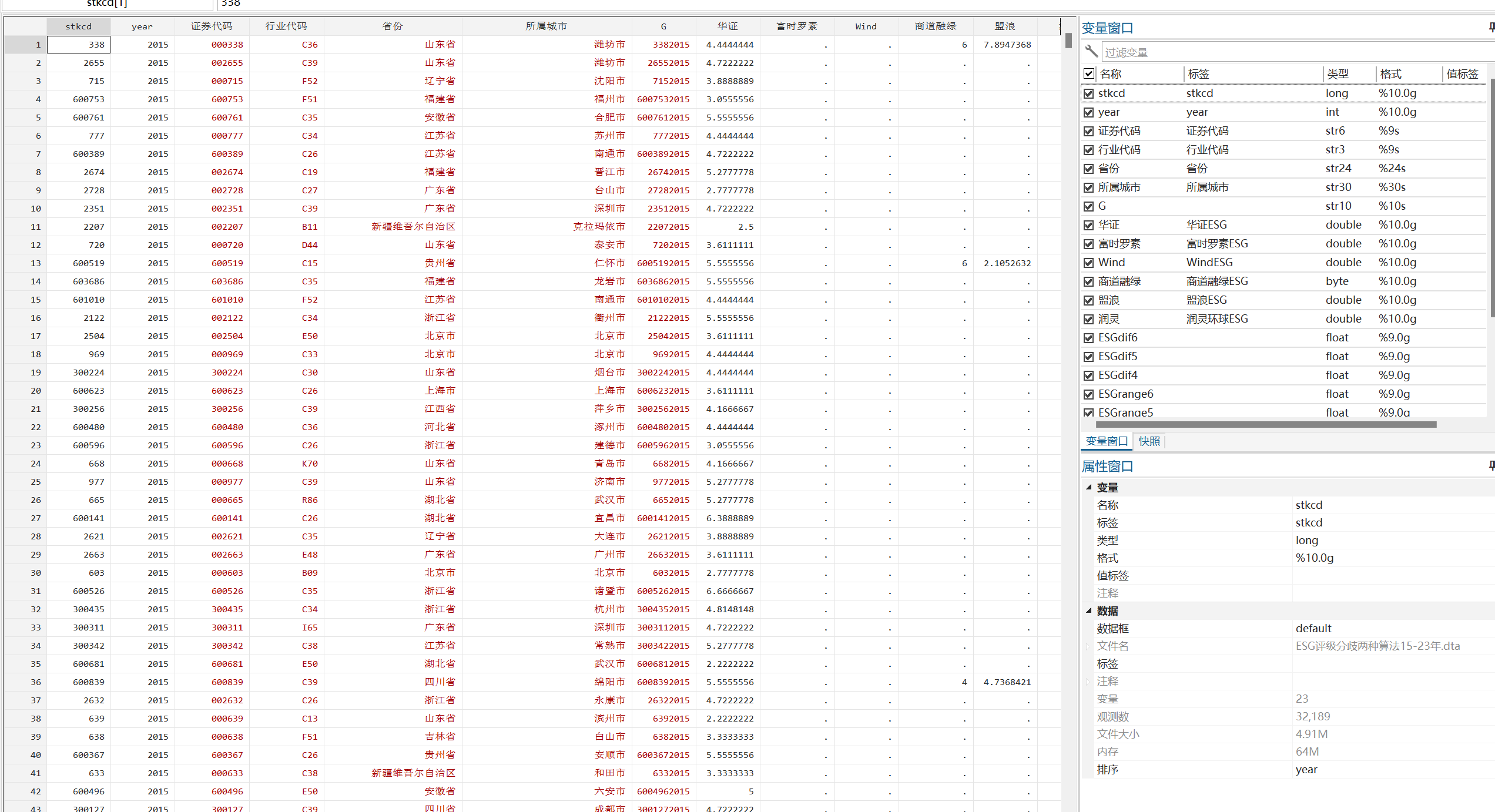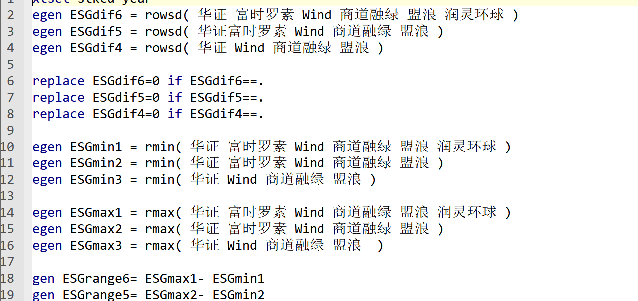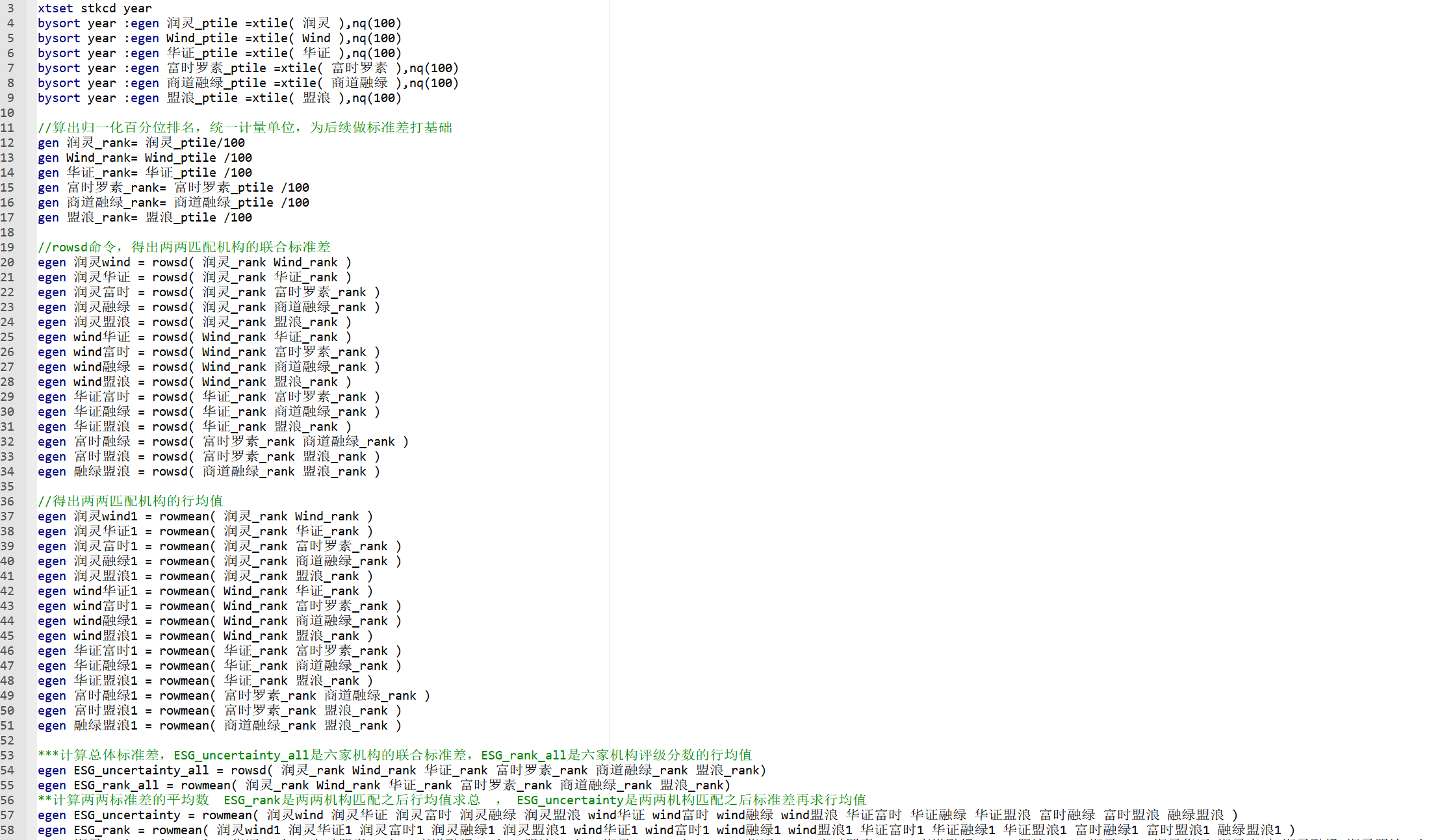 8、华、万、商、盟、富、润6种,直接计算当年对该企业评级的所有机构所提供排名的标准差,作为企业当年ESG评级分歧(ESG_rank)