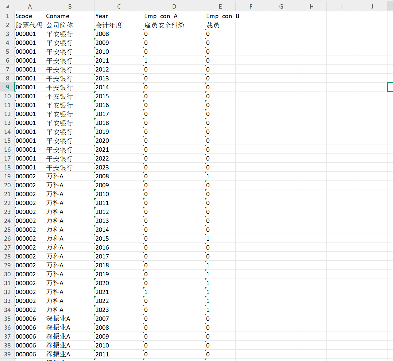 Emp_con_A[雇员安全纠纷]-如公司最近由于违反雇员健康安全准则,支付了大量罚款或者民事赔偿,或者公司卷入了大的有关健康和安全纷争中,则为1,否则为0