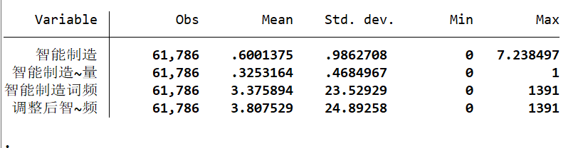 处理软件:原始数据为使用Python对上市公司年报进行文本分析后获得(jieba分词,停用词表使用哈工大停用词表),后续使用Stata进行整理,最终形成面板数据形式