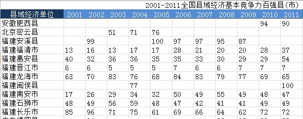 (其中,数据表示各县各年排名,空白区域表示该县当年并未进入百强名单)