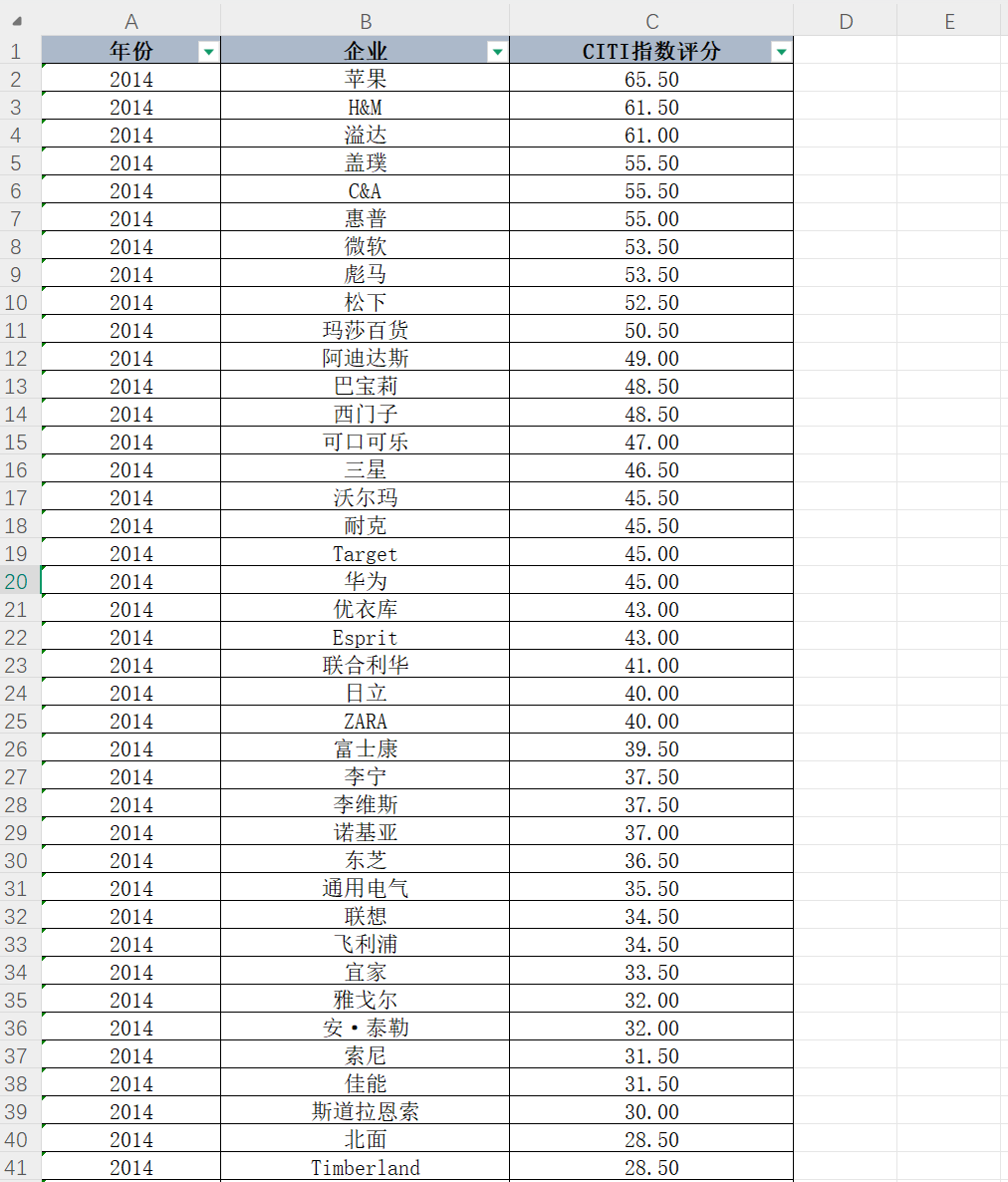 年份、企业、CITI指数评分、CATI指数评分。