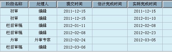 champion168 发表于 2012-4-7 19:24 阶段名称 处理人 提交时间 估计完成时间 实际完成时间 意见 审改稿 初审 编辑 2012-03-07 2012-03-07 ...