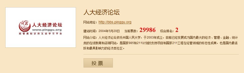 网站介绍:人大经济论坛依托中国人民大学,于2003年成立,目前已经发展成为国内最大的经济、管理、金融、统计类的在线教育和咨询网站,是国家985和211计划的支持项目和国家211工程在经管领域的标志性成果,也是国内最活跃和最具影响力的经济类社区。