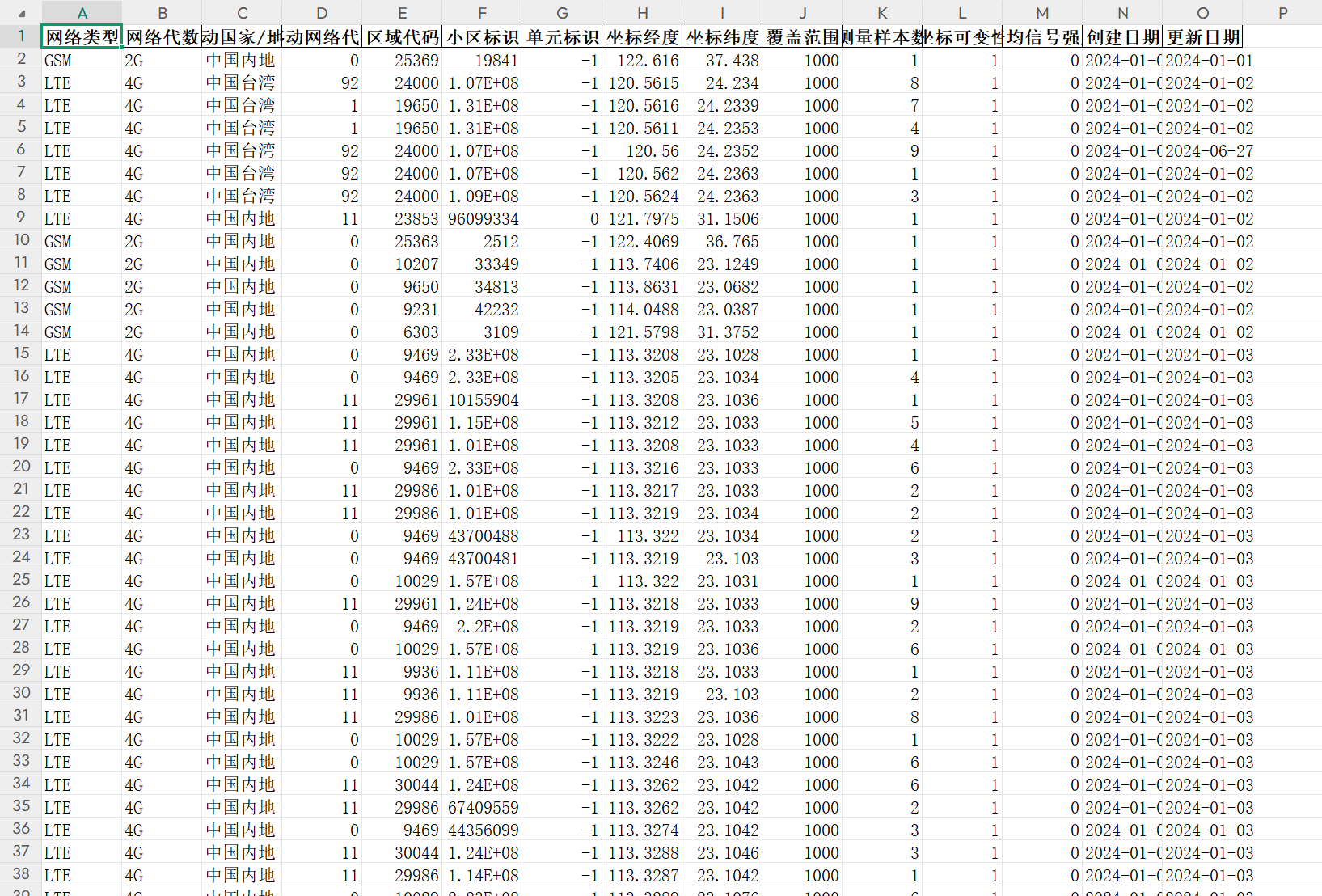| 指标名称 | 说明 | 网络类型 | GSM、UMTS、LTE 、CDMA、NR 之一 | 网络代数 | 包括2G、3G、4G、5G | 移动国家代码 | MMC,Mobile Country Code | 移动网络代码 | GSM、UMTS、LTE 为 MNC;CDMA 为 SID | 区域代码 | GSM/UMTS 为 LAC;LTE 为 TAC;CDMA 为 NID | 小区标识 | GSM/LTE 为 CID;UMTS 为 UTRAN 小区 ID / LCID;CDMA 为 BID | 单元标识 | UMTS 为 PSC;LTE 为 PCI;GSM/CDMA 为空 | 经度 | -180.0 至 180.0 度,坐标可变性决定是否为平均值或精确值 | 纬度 | -90.0 至 90.0 度,坐标可变性决定是否为平均值或精确值 | 覆盖范围 | 小区范围估计值,单位为米 | 测量样本数 | 分配给基站的测量总数 | 坐标可变性 | 定义坐标是精确还是通过测量计算得出 | 创建时间 | 基站首次添加到数据库的日期 | 更新时间 | 基站最后一次更新的日期 | 平均信号强度 | 所有测量的平均信号强度,单位为 dBm 或 TS 27.007 8.5 定义的值 |