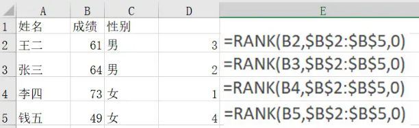 =RANK(排名的数字,引用区域,排序方式[0:降序,1:升序])