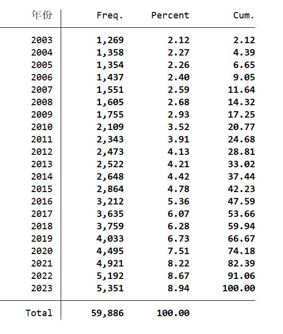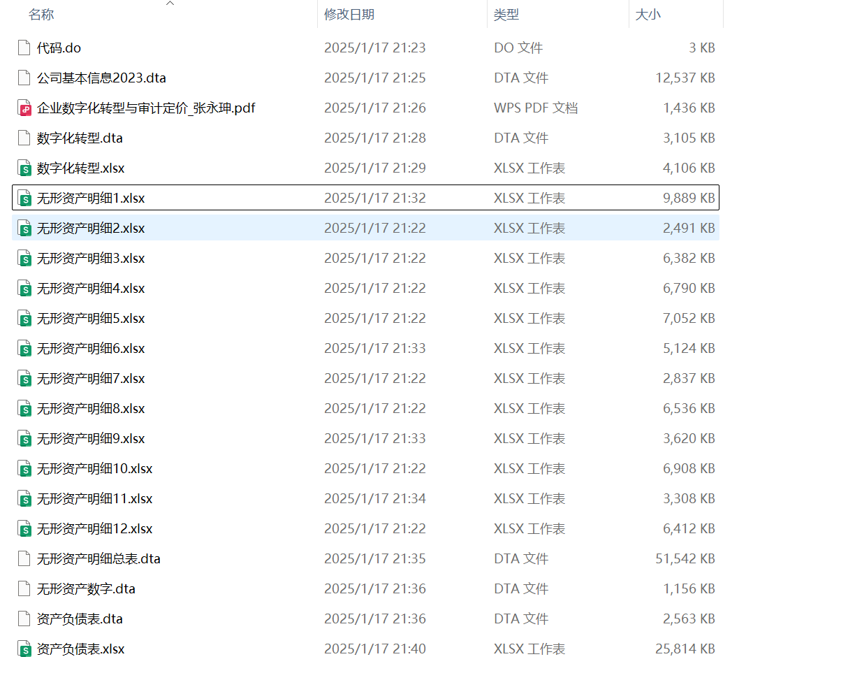 当无形资产明细项包含“软件”“网络”“客户端”“管理系统”“智能平台”等与数字化转型技术相关的关键词以及与此相关的专利时,将该明细项目界定为“数字化技术无形资产”,再对同一公司同年度多项数字化技术无形资产进行加总,计算其占本年度无形资产的比例,即为企业数字化转型程度的代理变量。