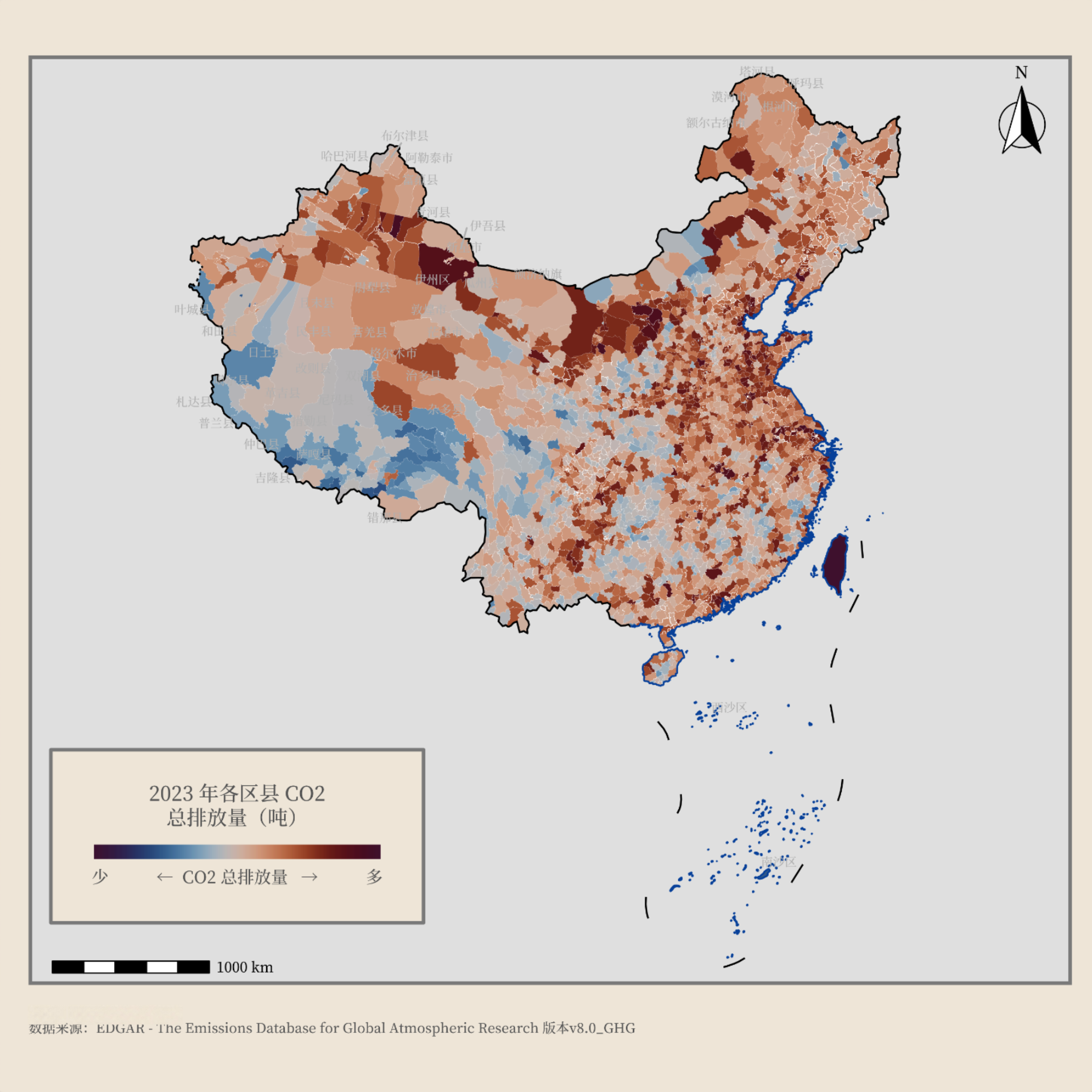 全国34个省市自治区直辖市(含港澳台)、371个城市、2800多个区县以及超过43000个乡镇街道的CO2碳排放数据。
