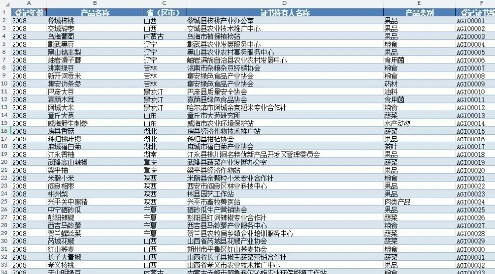 数据指标:登记年份 产品名称 省(区市) 证书持有人名称 产品类型 登记证书编号