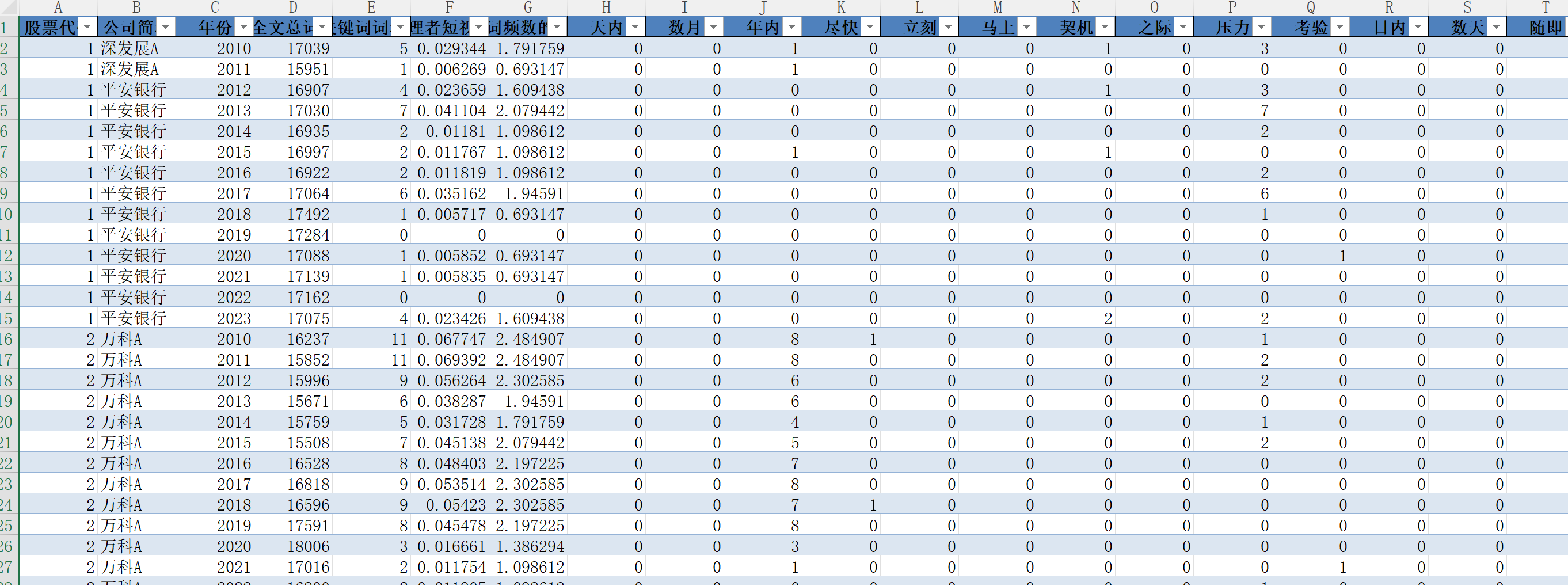 股票代码 公司简称 年份 全文总词数 关键词词频 管理者短视主义 词频对数 各关键词词频