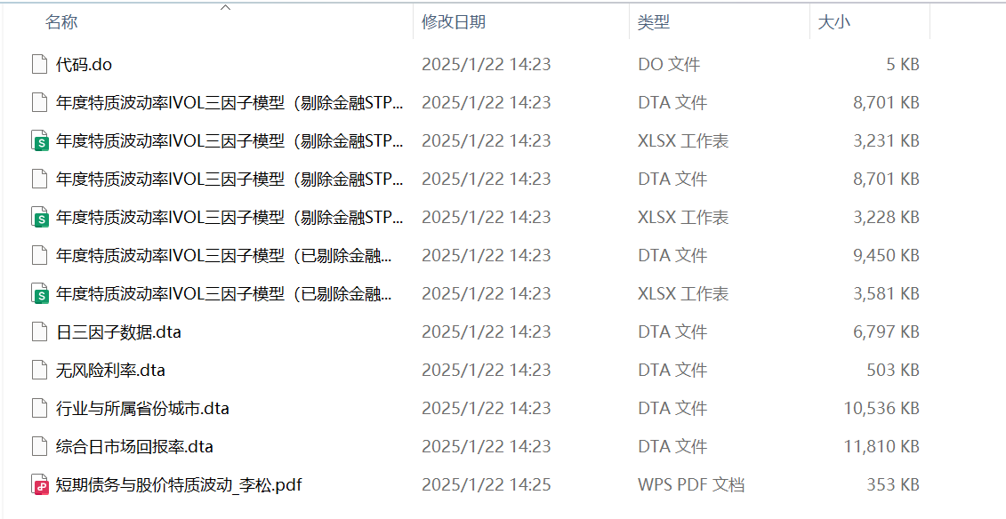 - 三个版本:年度特质波动率IVOL三因子模型(剔除金融STPT版)、年度特质波动率IVOL三因子模型(剔除金融STPT缩尾版)、年度特质波动率IVOL三因子模型(已剔除金融未剔除STPT版)