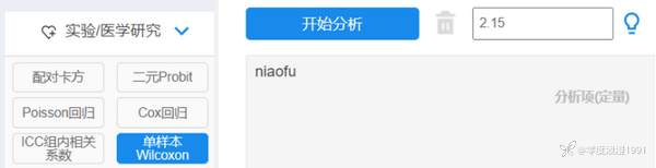 仪表盘中依次选择【实验/医学研究】→【单样本Wilcoxon】模块,将“niaofu”变量拖拽至【分析项(定量)】框内,选项框内容输出数字“2.15”,操作设置见图 4-21,最后单击【开始分析】。