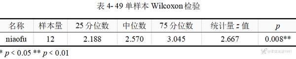 Wilcoxon符号秩和检验,可用于单个样本中位数和总体中位数的差异比较,这里将该过程称之为单样本Wilcoxon检验。此时,研究假设是推断某随机样本位置参数(如中位数)是否和已知总体位置参数相等。