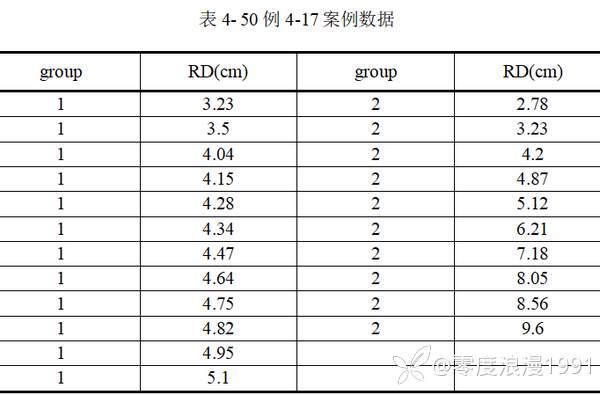 【例4-17】对10例肺癌病人和12例矽肺病人,用X光片测量肺门横径右侧距[color=var(--dui-color-purple-p9)]RD值(cm),结果如表 4-50所示,试分析两个人群的RD值有无差别。数据来源于陈平雁(2005),数据文档见“例4-17.xls”。
