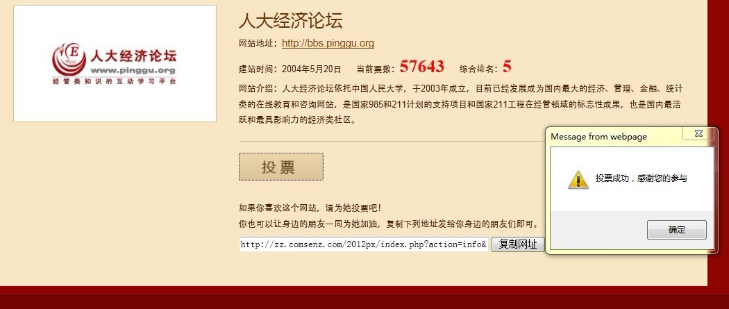 nulsy 发表于 2012-3-16 05:44 楼主太厉害了,这么晚了,还坚持评分,真是神人,和我一样,热心支持人大论坛, 我请QQ上的朋友投了不少 ...