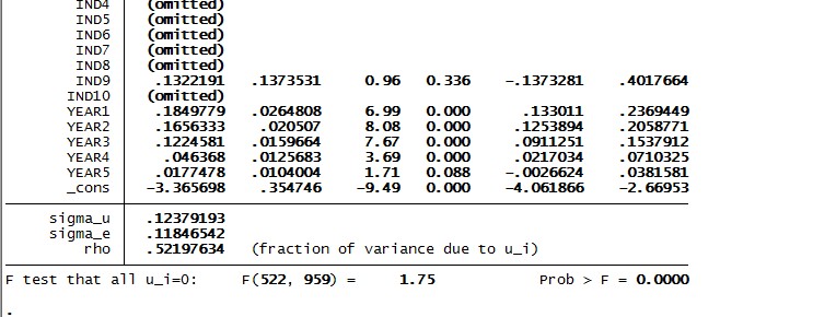 469856362 发表于 2013-10-5 11:06 因为是用固定效应估计的,固定效应不会识别出时不变变量,行业是时不变变量,所以会产生多重共线性。
