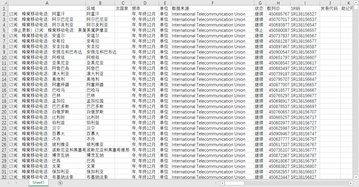 ITUWTID电信统计全球世界各国地区1960-2023蜂窝移动电话预付订阅移动宽带数据语音固定电话固话等